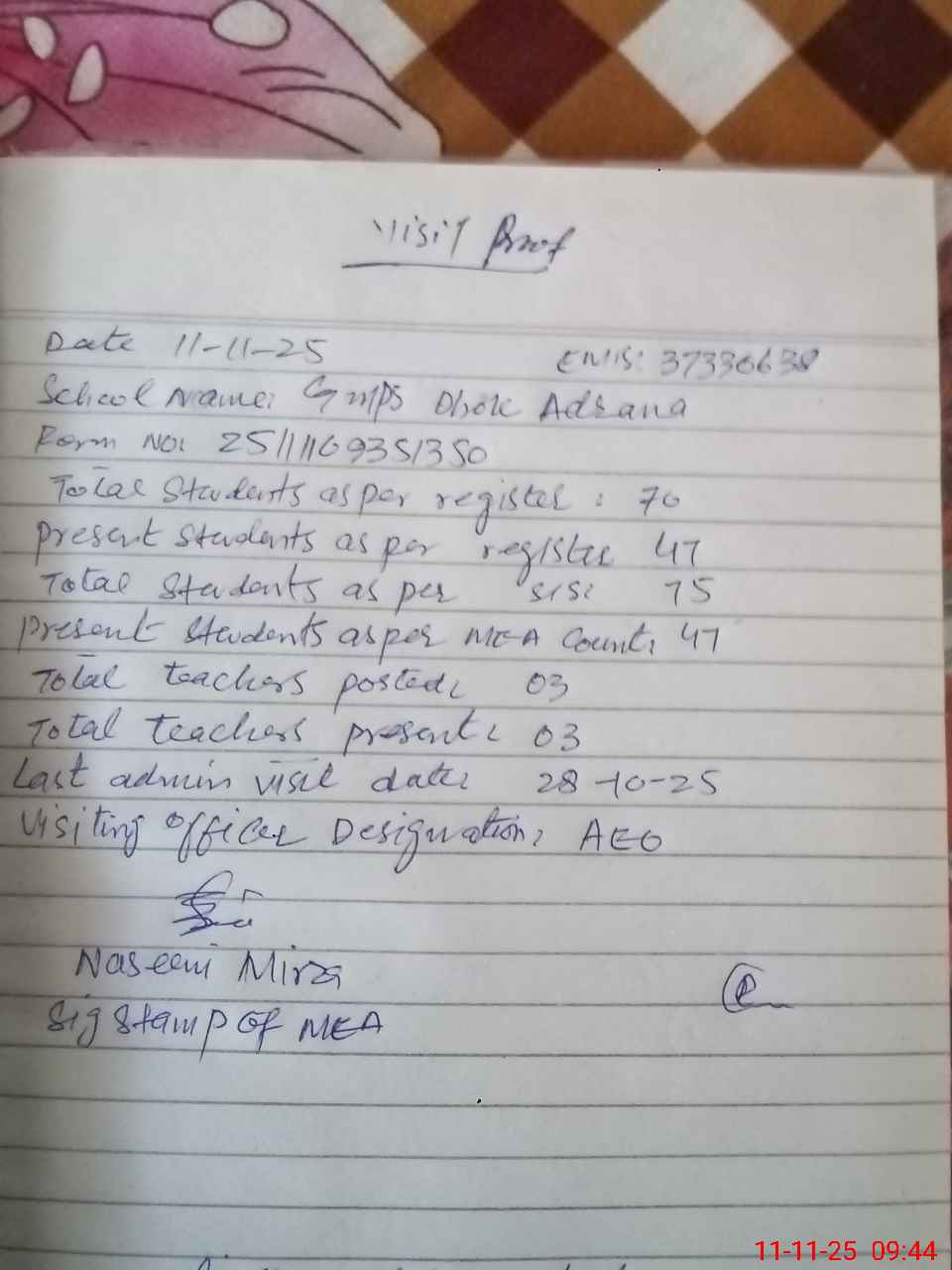 | Certified that this School was Inspected by the Undersigned MEA/DMO Today and the Information Stated Above is as Per Record. | |||||