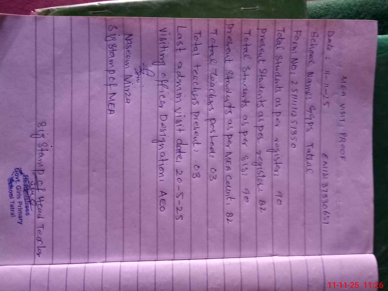 | Attendance Register | Head Teacher | MEA with School | Visit Proof |