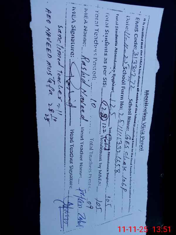 | Attendance Register | Head Teacher | MEA with School | Visit Proof |