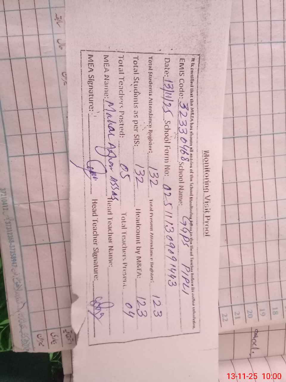 | Attendance Register | Head Teacher | MEA with School | Visit Proof |