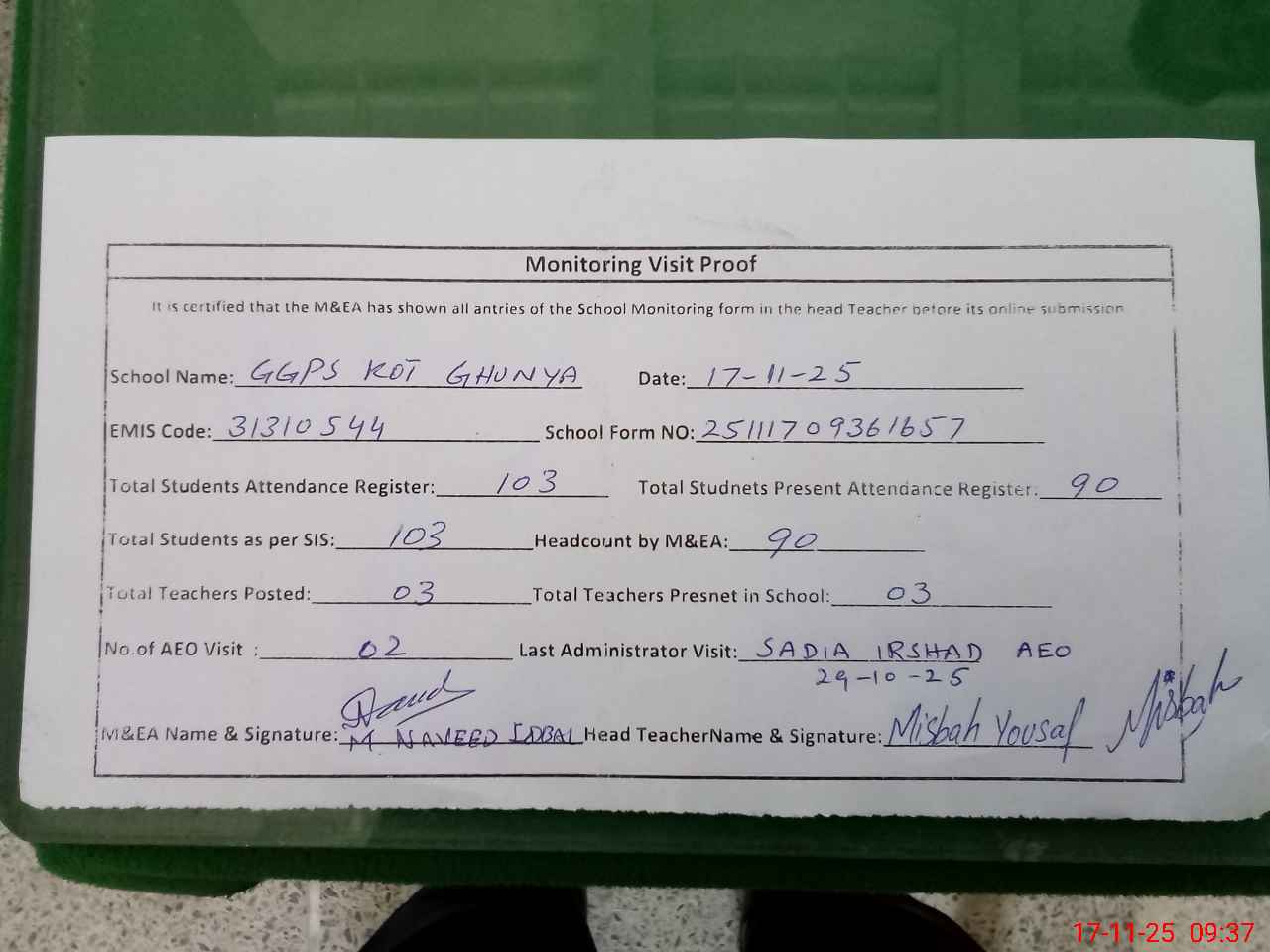 | Attendance Register | Head Teacher | MEA with School | Visit Proof |