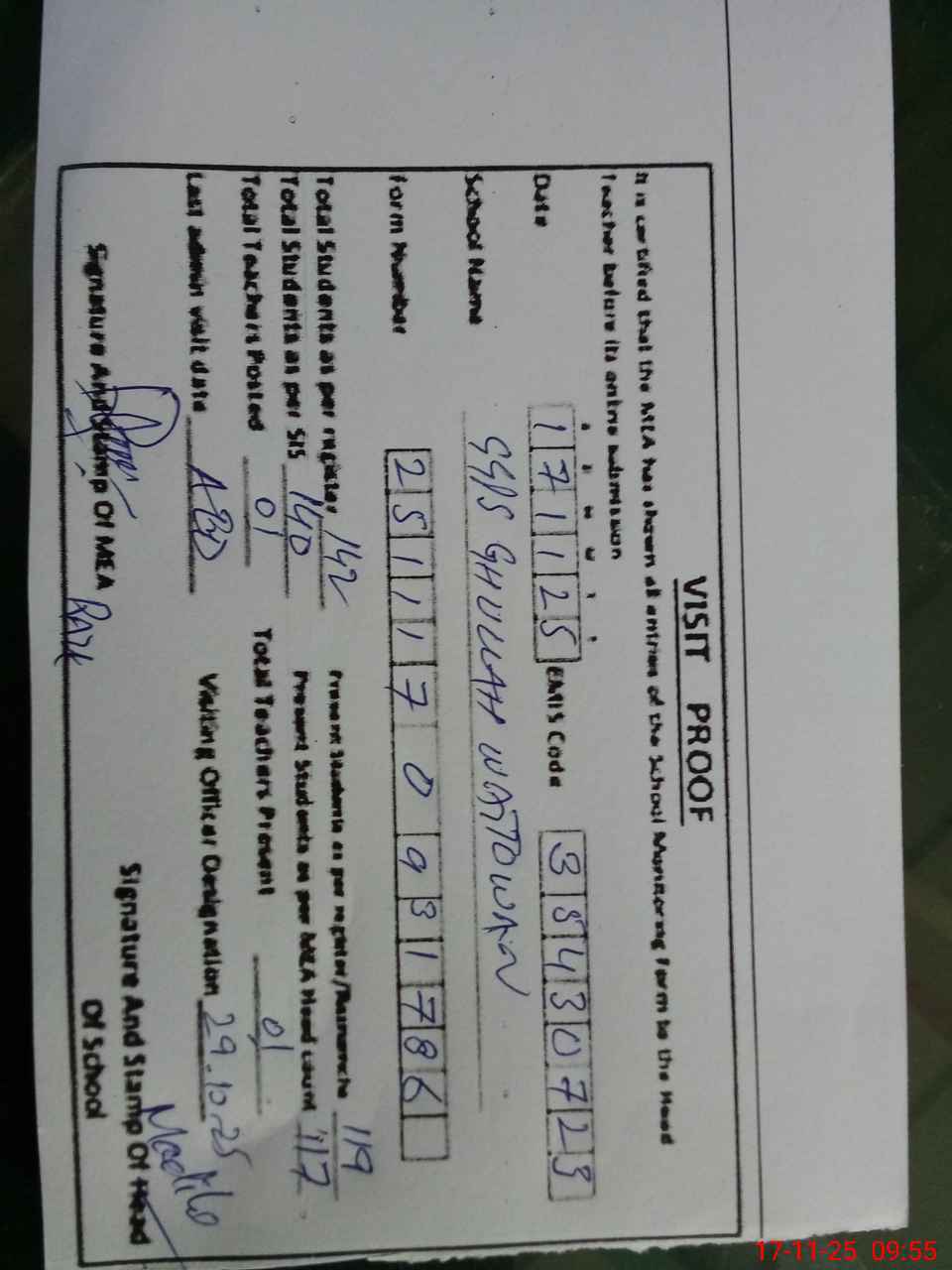 | Attendance Register | Head Teacher | MEA with School | Visit Proof |