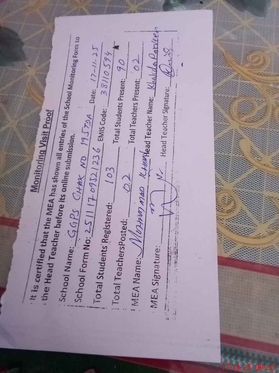| Attendance Register | Head Teacher | MEA with School | Visit Proof |
