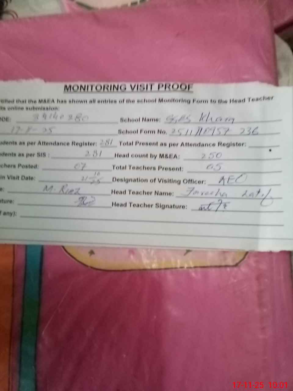 | Attendance Register | Head Teacher | MEA with School | Visit Proof |