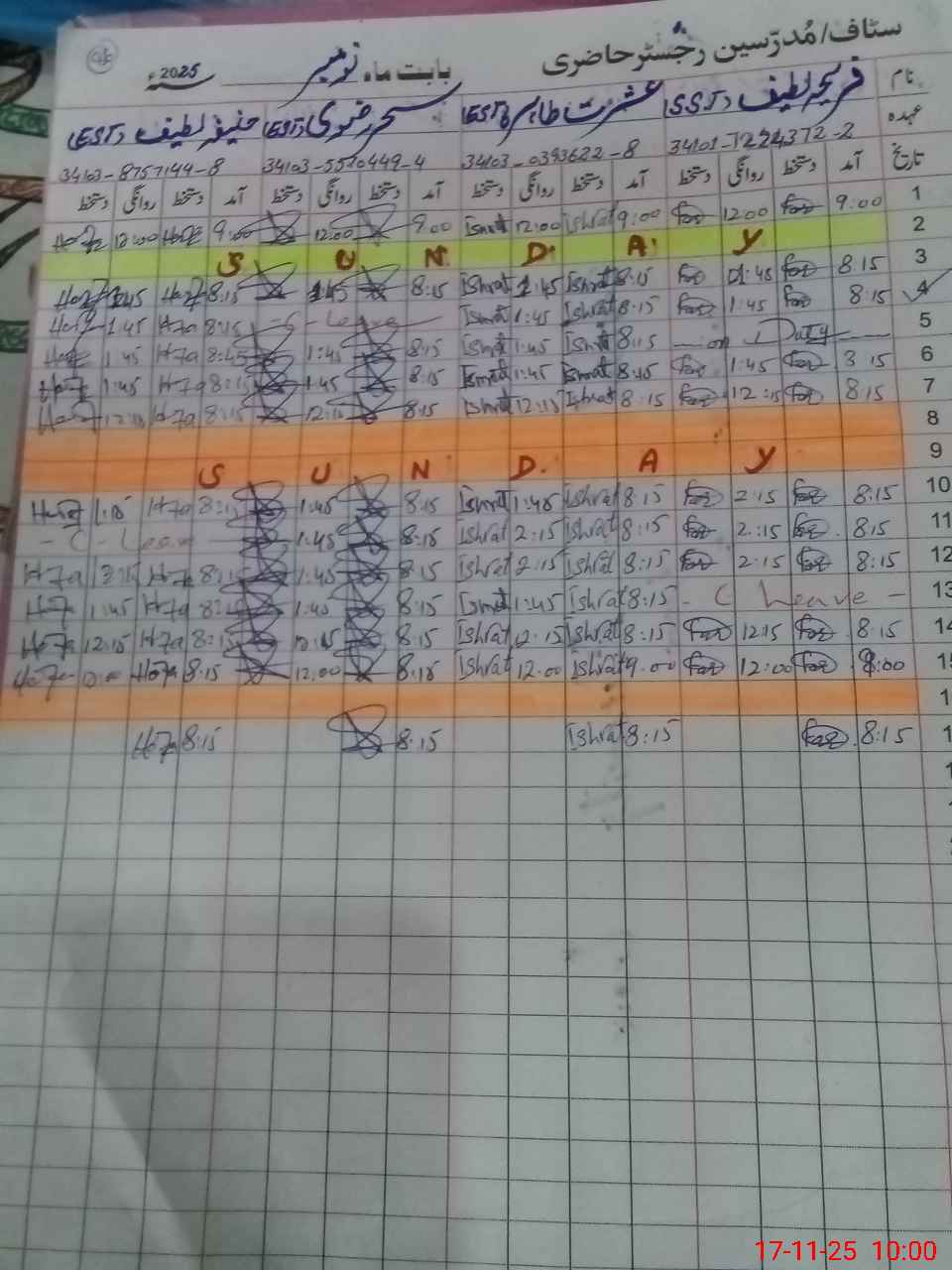 | CNIC | Full Name | Designation | R/C | Absence during last cal. month |