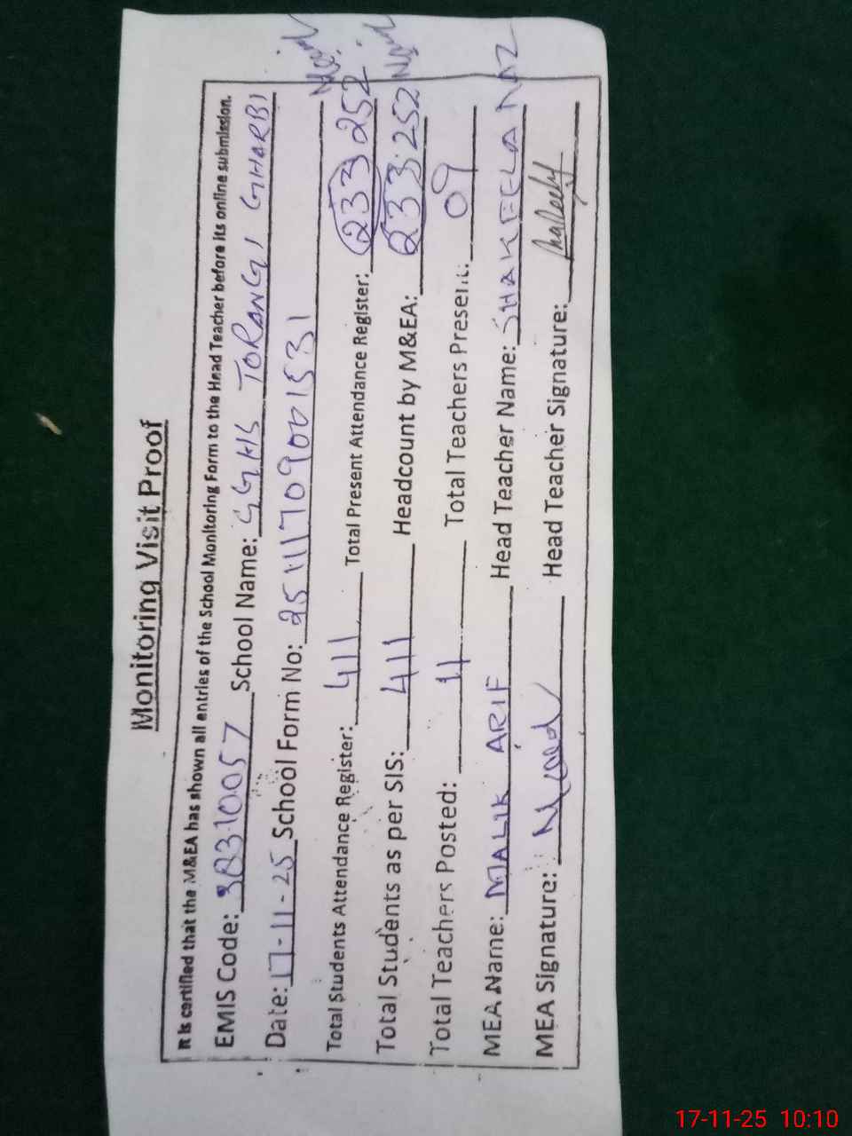 | Total no. of Classrooms: 13 No. of Classrooms Used for Teaching: 11 No. of Classrooms Storing Old Furniture, FTBs, etc: 0Comments if Any: Teacher Maroof Fatima EST marked as absent as she had to join this school on 30th October however she is absent from her duty till date Junior clerk Awais marked as absent as he was not physically present Two toilets found nonfunctional Teacher Naheed |