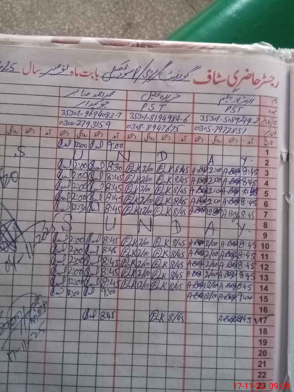 | CNIC | Full Name | Designation | R/C | Absence During Last Calender Month |