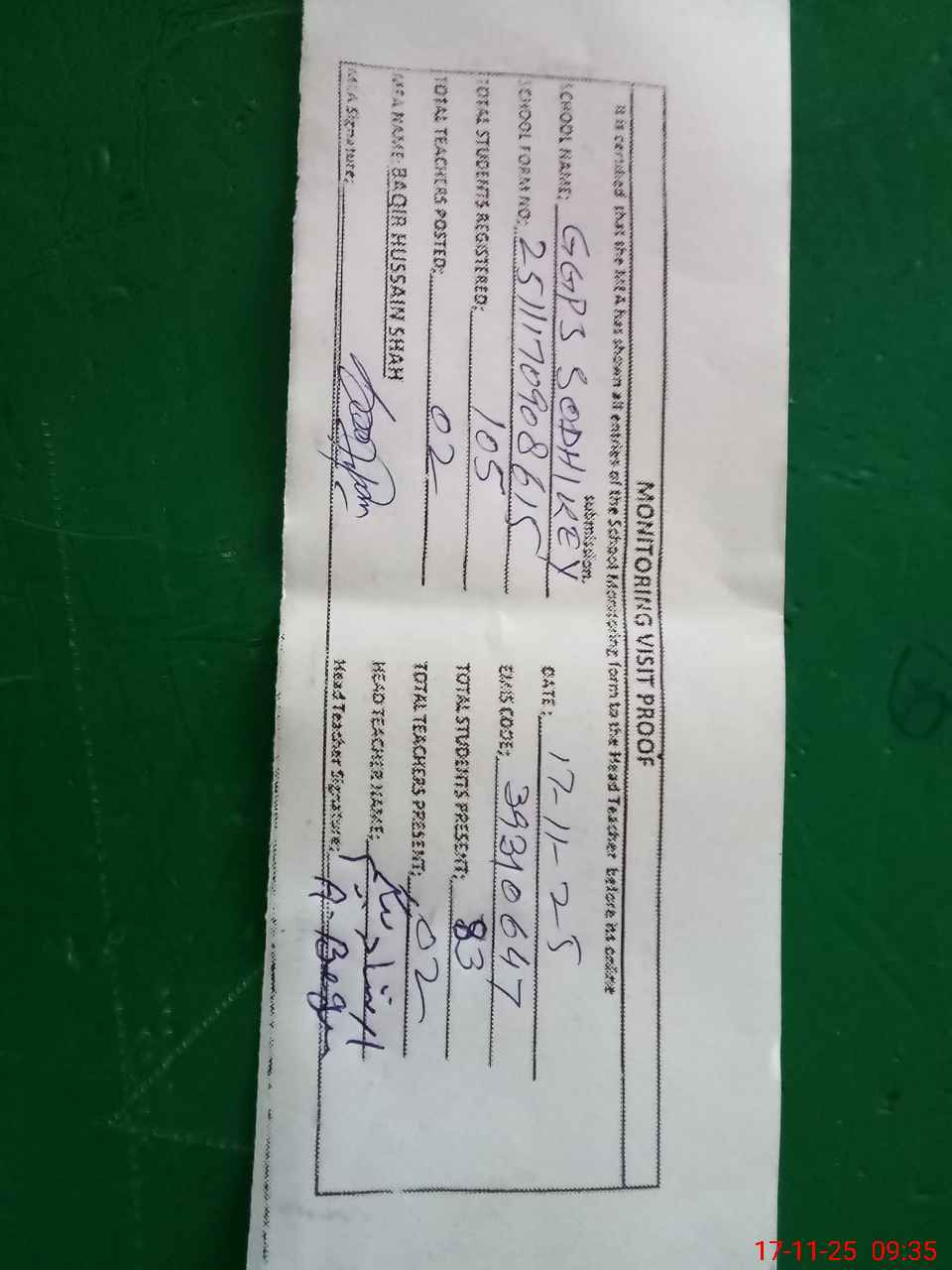 | Remarks (Use Separate Page if Required): Last admin visit by AEO 4Nov 2025 | |||||