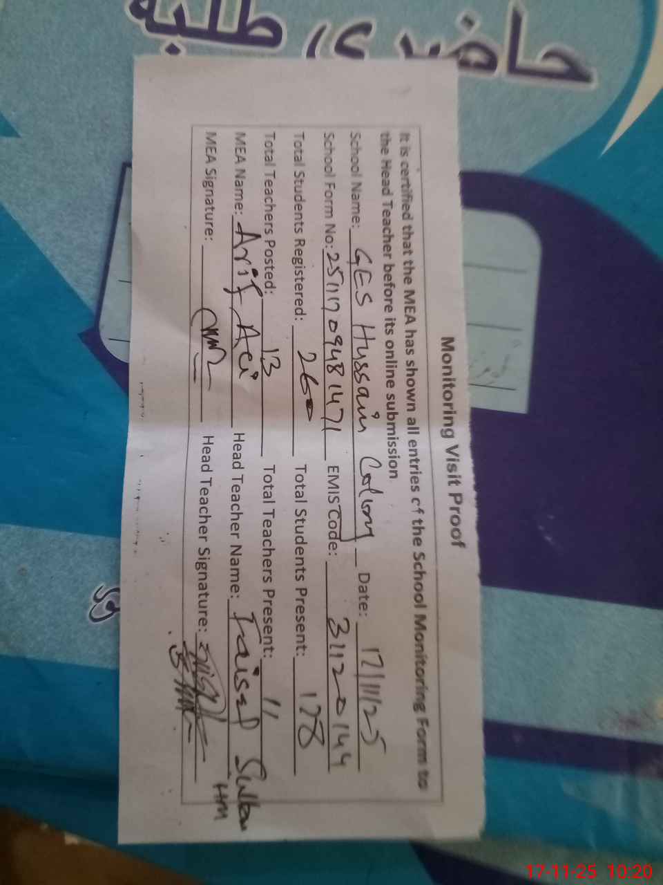 | Attendance Register | Head Teacher | MEA with School | Visit Proof |