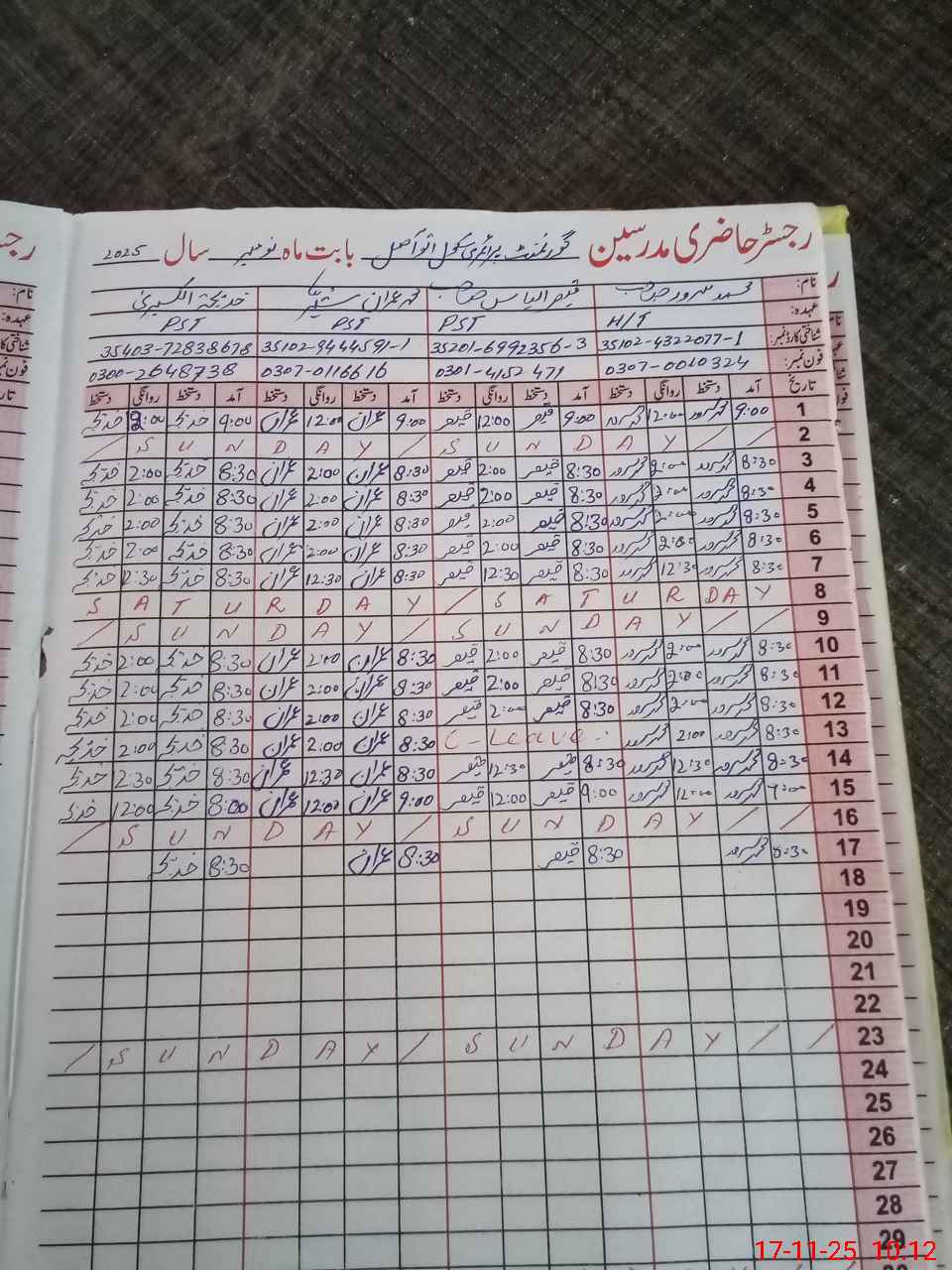 | CNIC | Full Name | Designation | R/C | Absence During Last Calender Month |