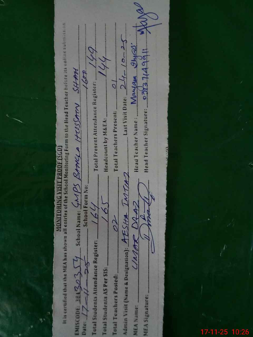 | Attendance Register | Head Teacher | MEA with School | Visit Proof |