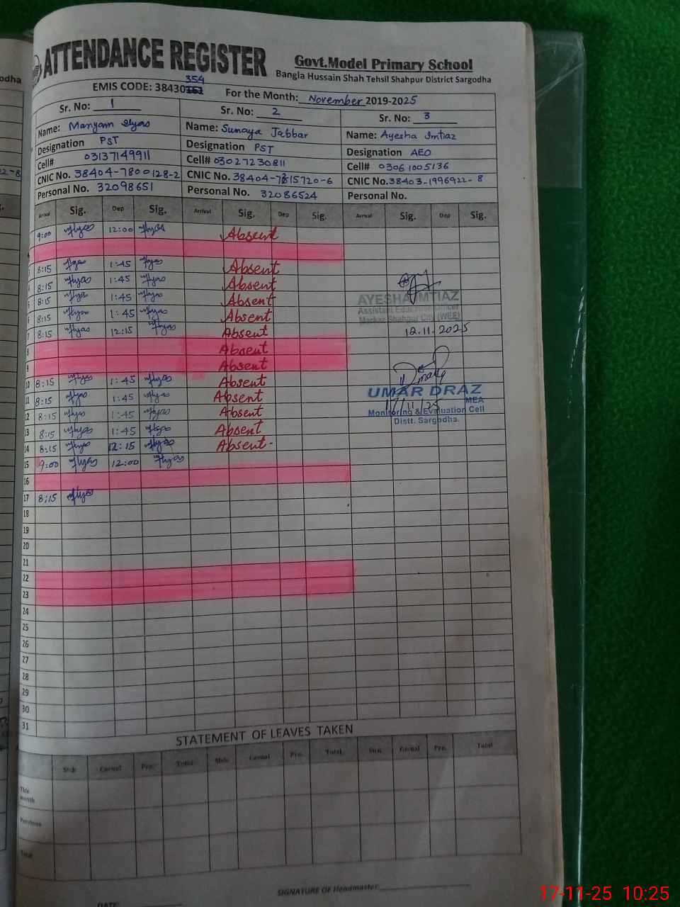 | CNIC | Full Name | Designation | R/C | Absence during last cal. month |