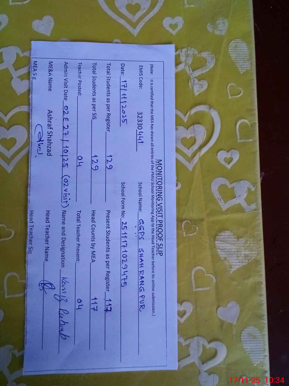 | Attendance Register | Head Teacher | MEA with School | Visit Proof |
