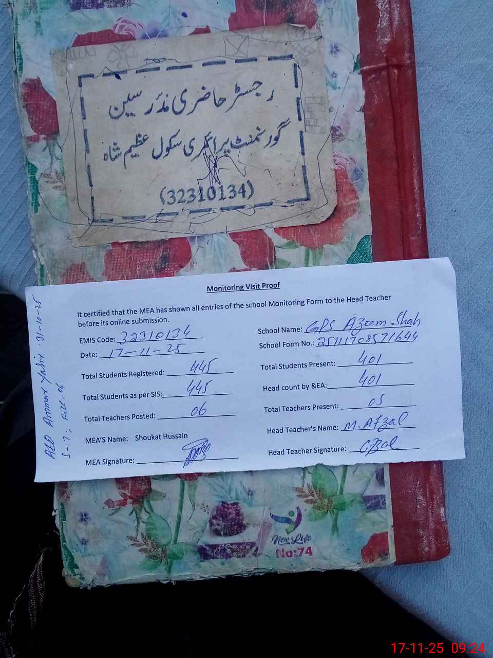 | Attendance Register | Head Teacher | MEA with School | Visit Proof |