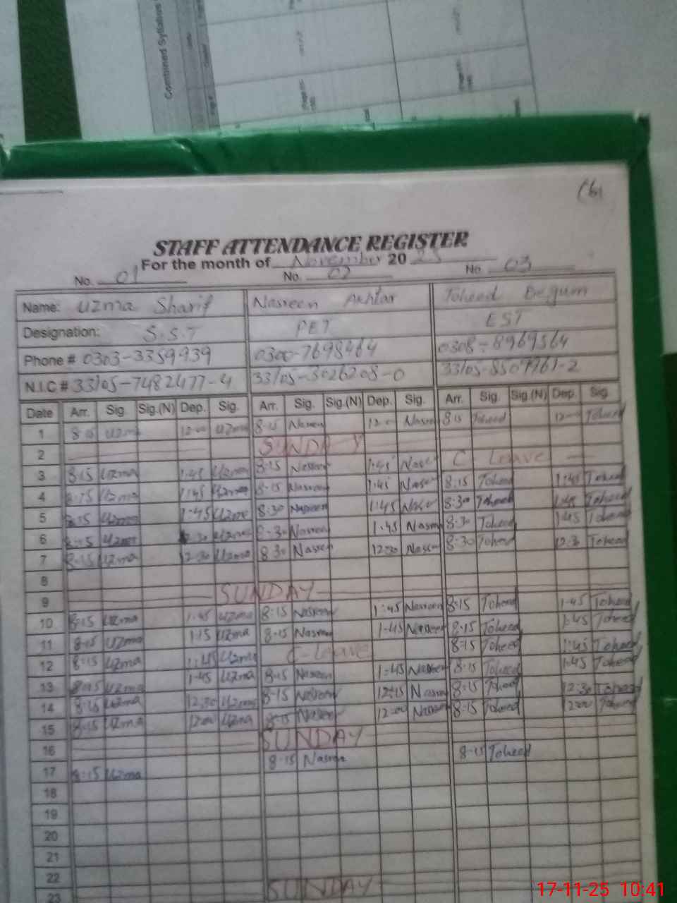 | CNIC | Full Name | Designation | R/C | Absence During Last Calender Month |