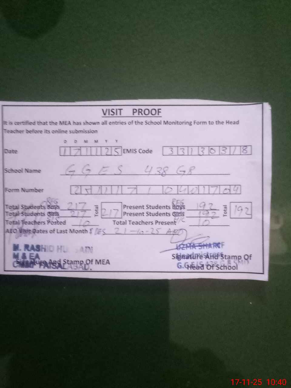 | Attendance Register | Head Teacher | MEA with School | Visit Proof |