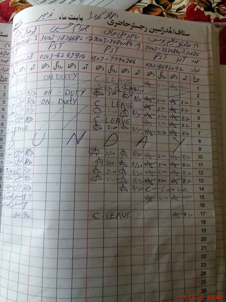| CNIC | Full Name | Designation | R/C | Absence During Last Calender Month |