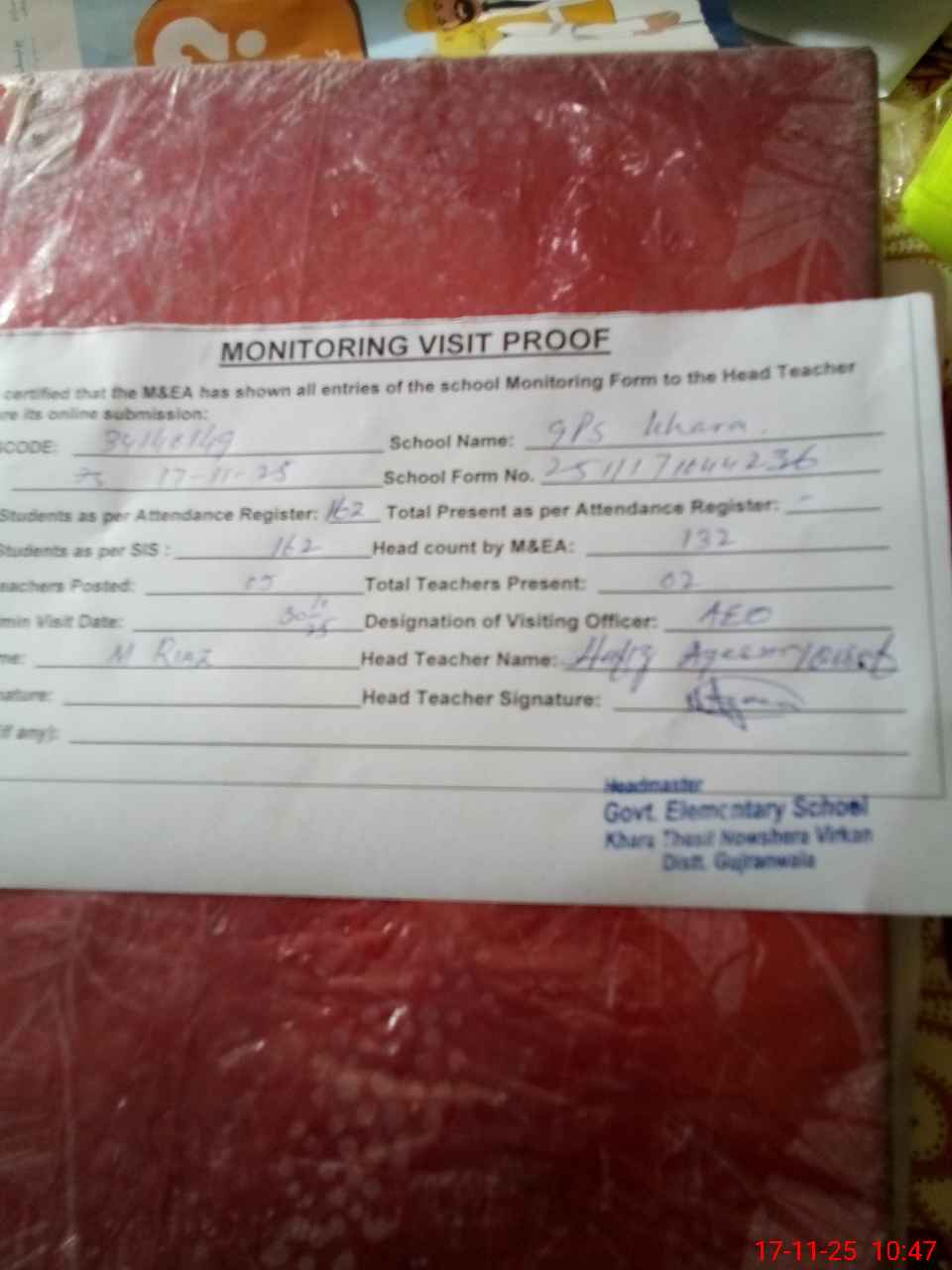 | Attendance Register | Head Teacher | MEA with School | Visit Proof |