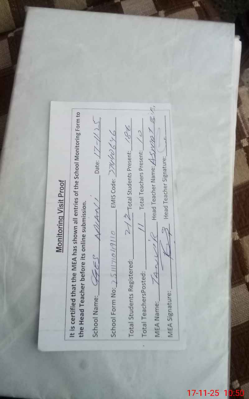 | Attendance Register | Head Teacher | MEA with School | Visit Proof |