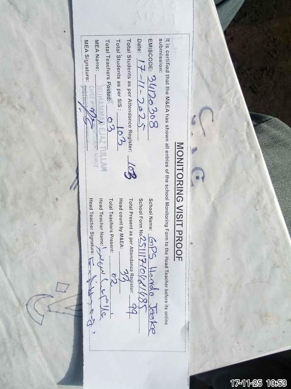 | Attendance Register | Head Teacher | MEA with School | Visit Proof |