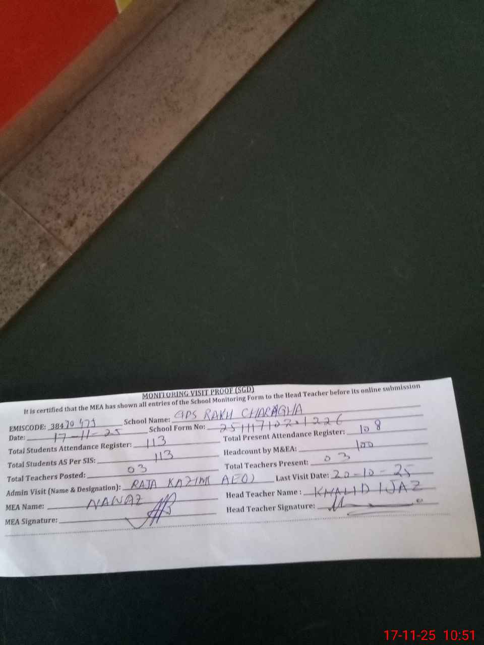 | Attendance Register | Head Teacher | MEA with School | Visit Proof |