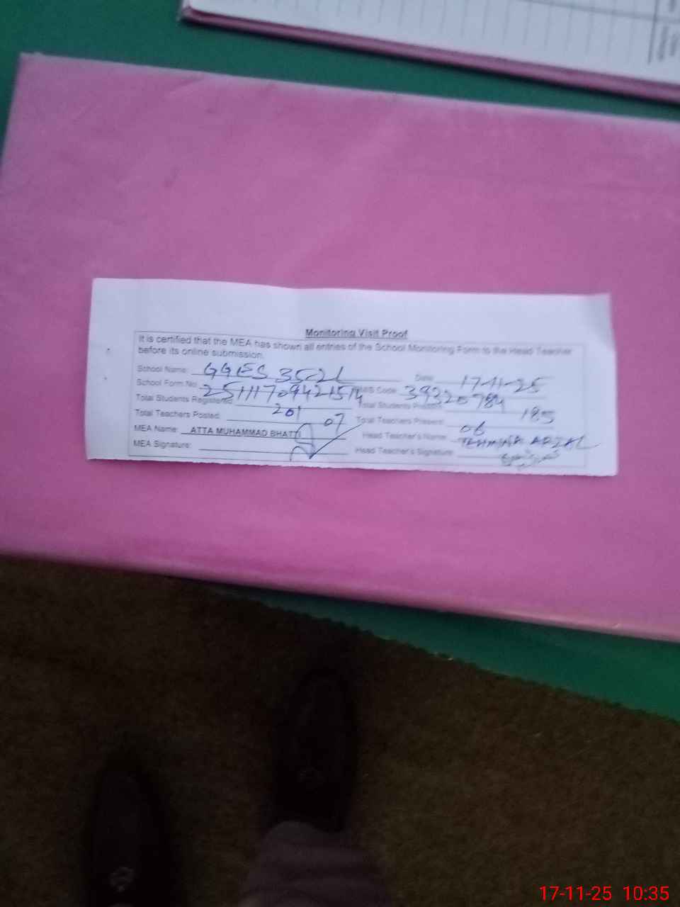 | Attendance Register | Head Teacher | MEA with School | Visit Proof |