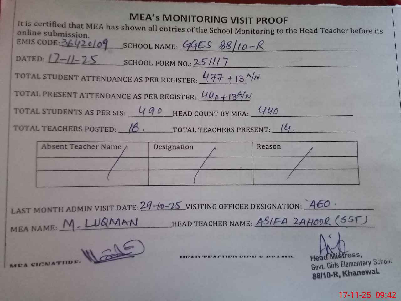 | EMIS Code: 36420109 | Name of School: GGES 88/10-R, KHANEWAL | |||