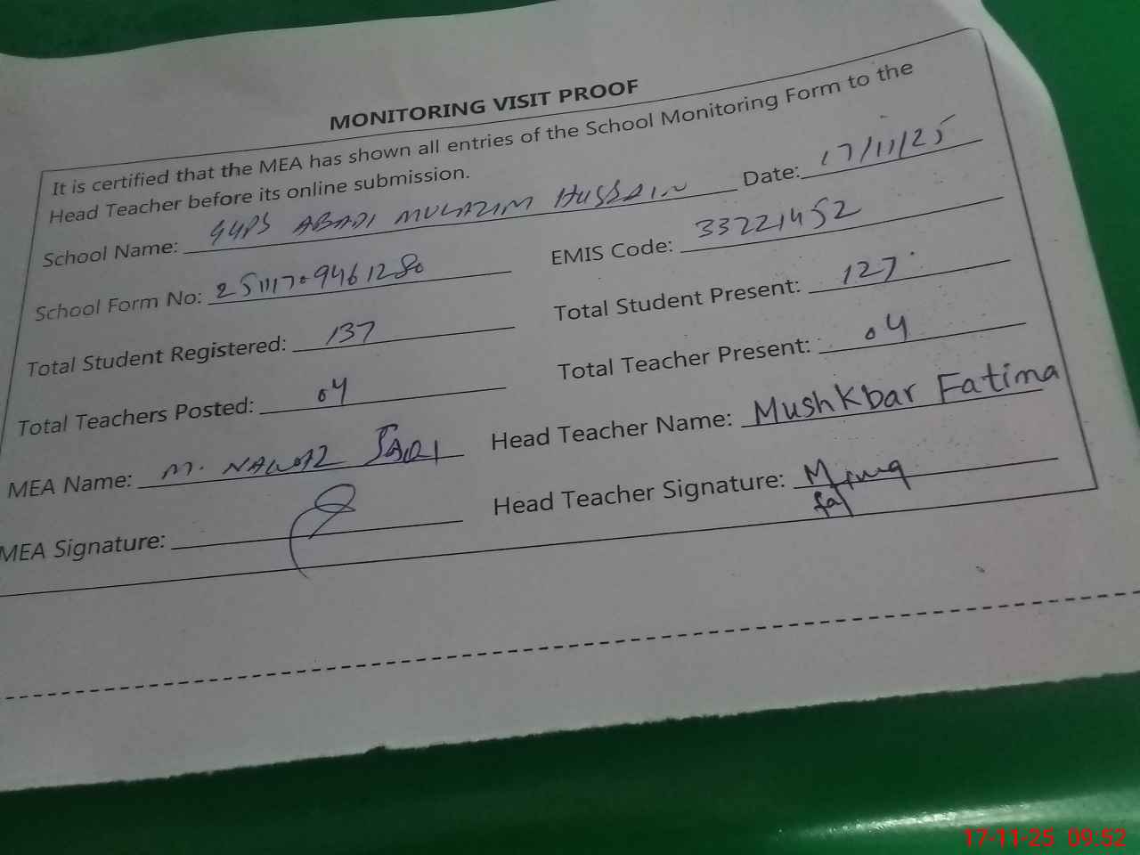 | EMIS Code: 33221452 | Name of School: GGPS ABADI MULAZIM HUSSAIN | |||