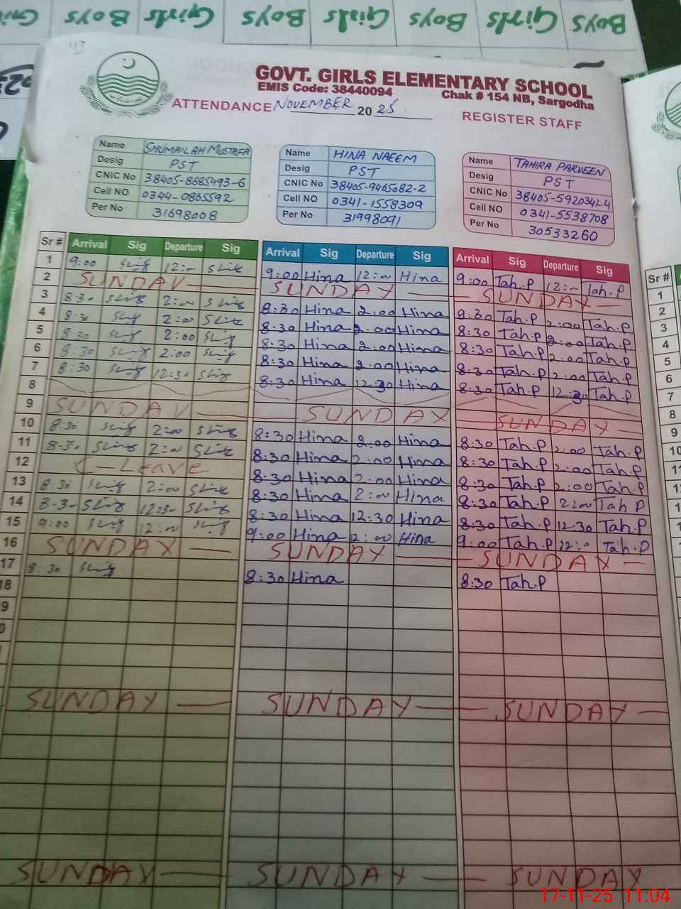 | CNIC | Full Name | Designation | R/C | Absence During Last Calender Month |