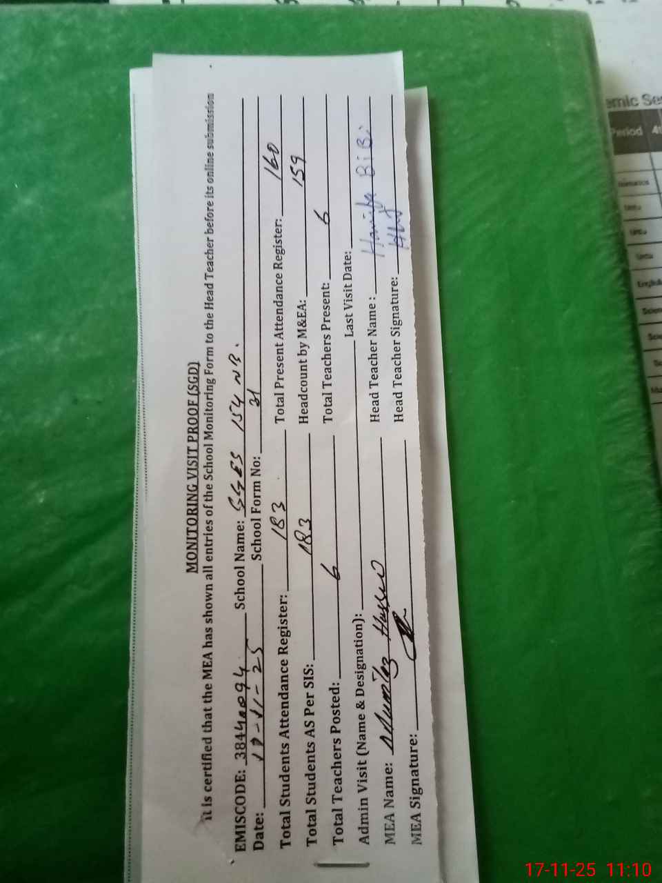 | Attendance Register | Head Teacher | MEA with School | Visit Proof |