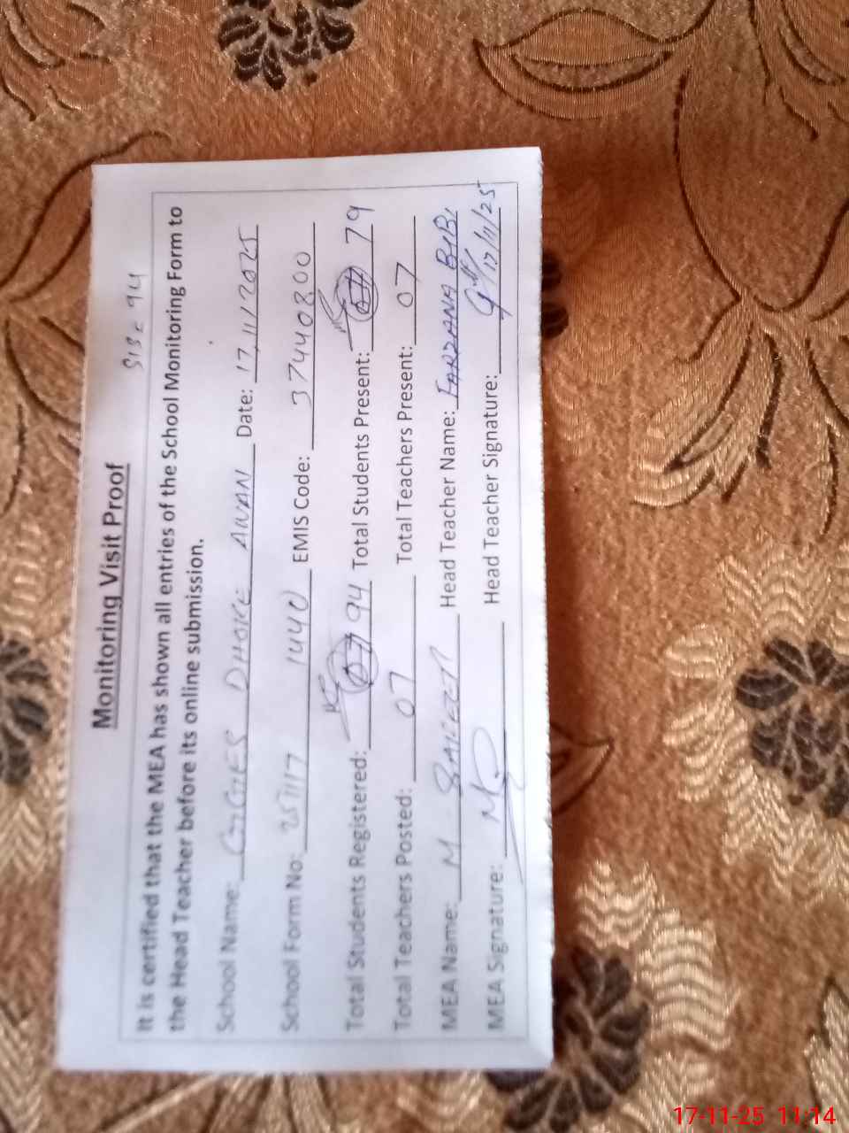 | Attendance Register | Head Teacher | MEA with School | Visit Proof |