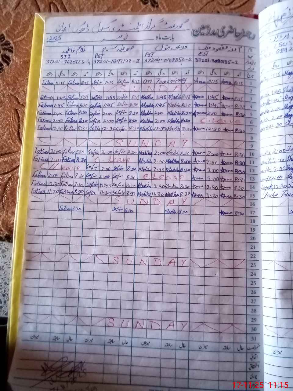 | CNIC | Full Name | Designation | R/C | Absence During Last Calender Month |