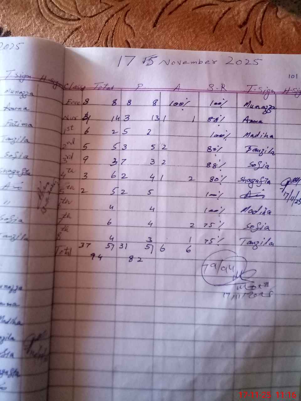 | Total Students Present | 16 | 0 | 16 | 8 | 8 | 7 | 6 | 7 | 4 | 4 | 3 | 79 | ||||