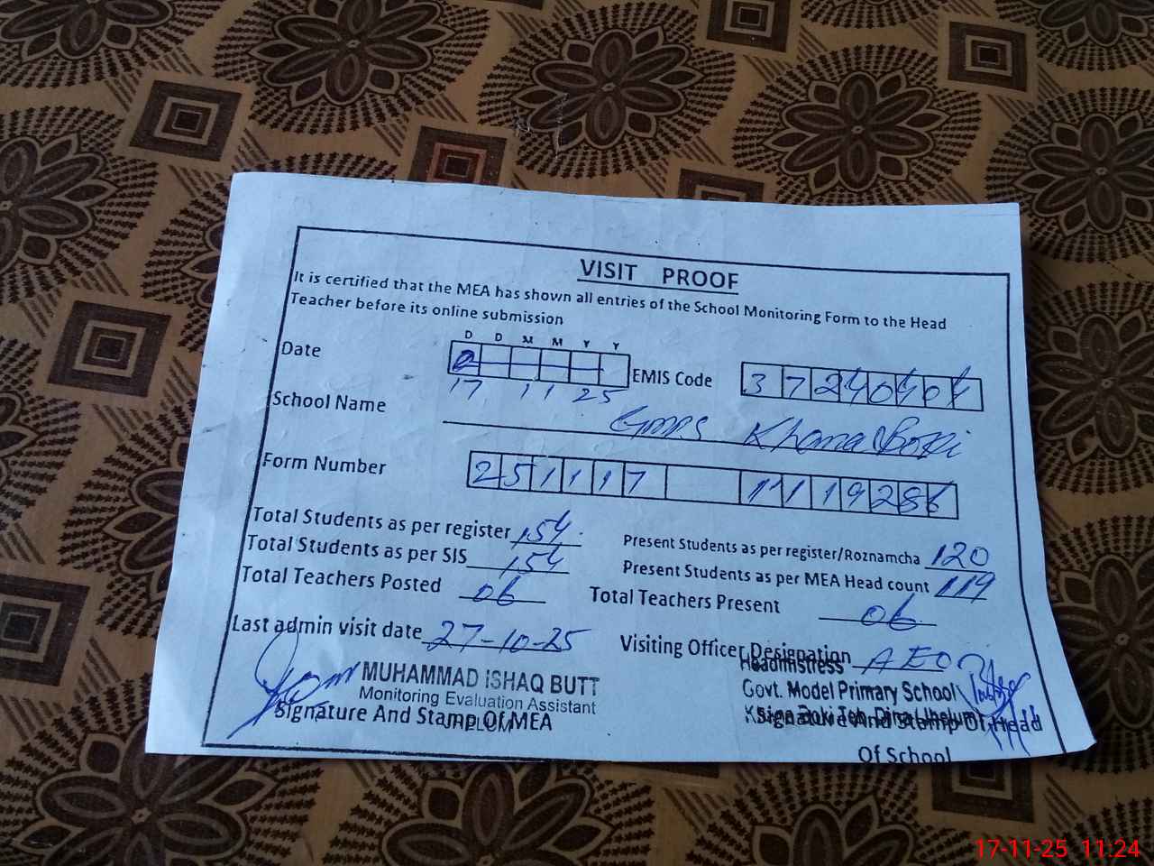 | Attendance Register | Head Teacher | MEA with School | Visit Proof |