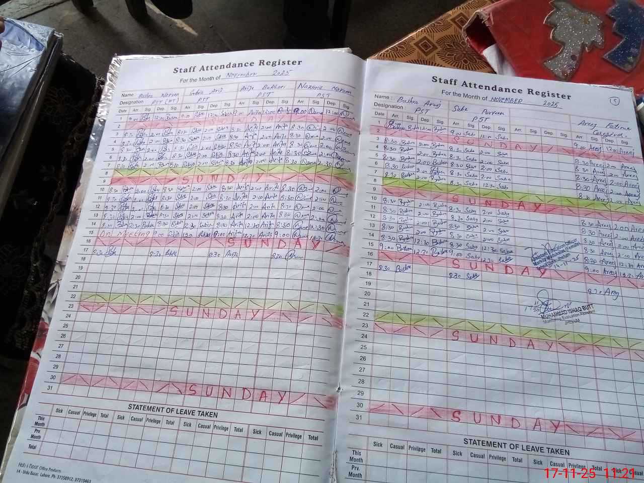 | CNIC | Full Name | Designation | R/C | Absence During Last Calender Month |