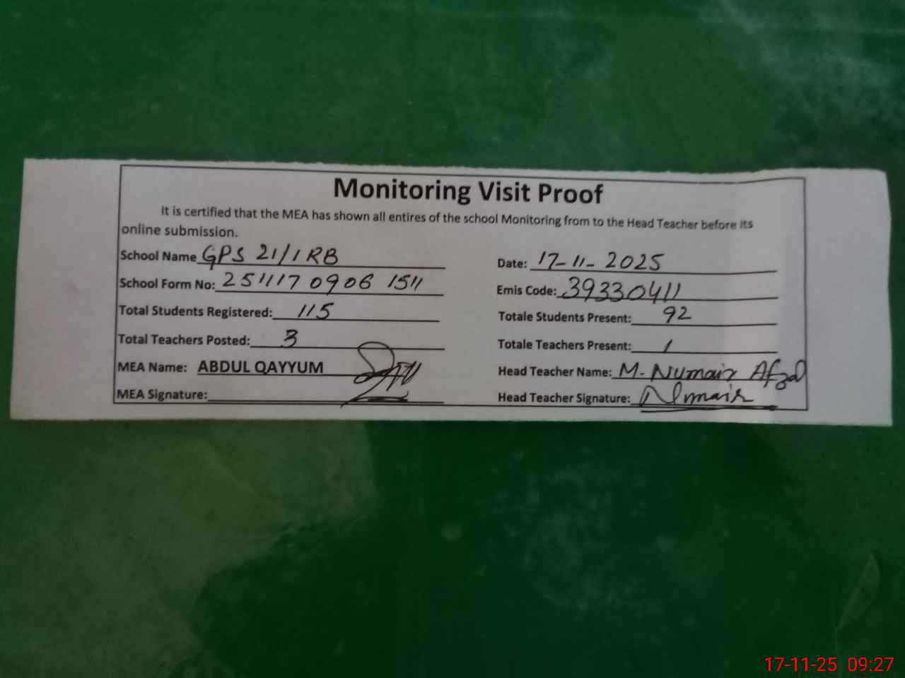 | EMIS Code: 39330411 | Name of School: GPS CHAK NO. 21/1-RB | |||