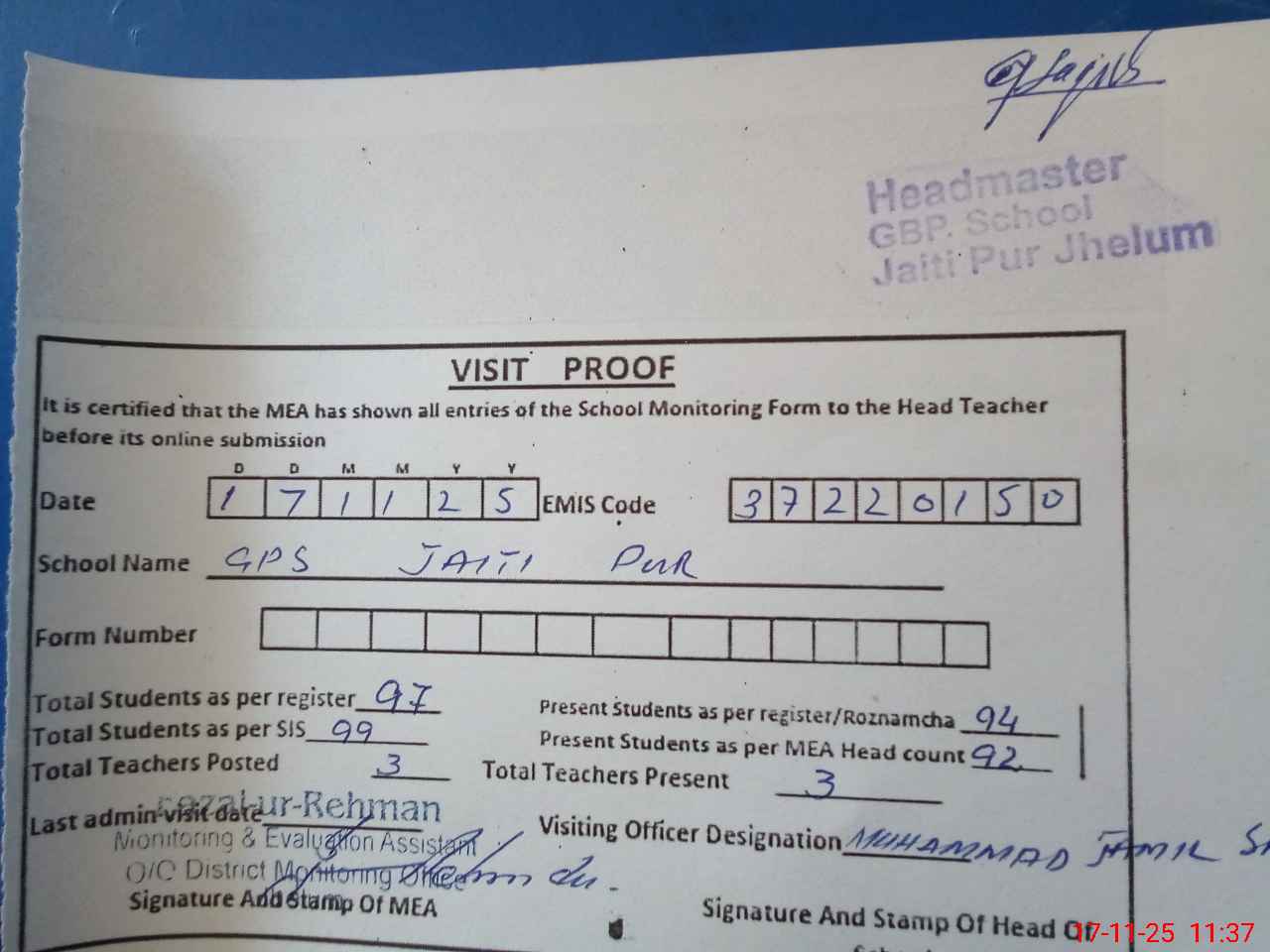 | EMIS Code: 37220150 | Name of School: GPS JATTI PUR | |||