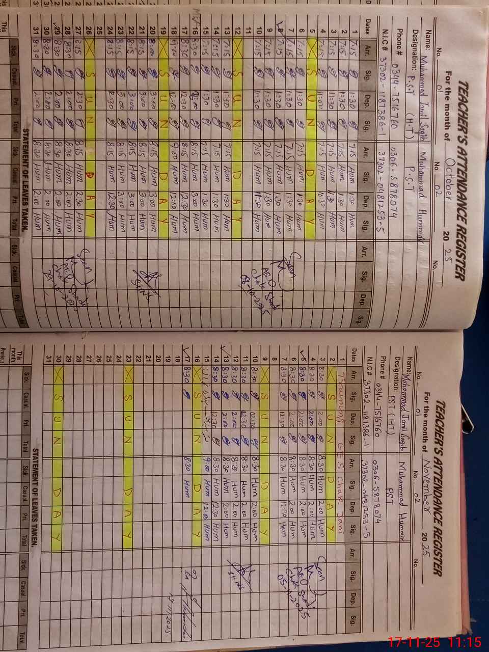 | CNIC | Full Name | Designation | R/C | Absence During Last Calender Month |