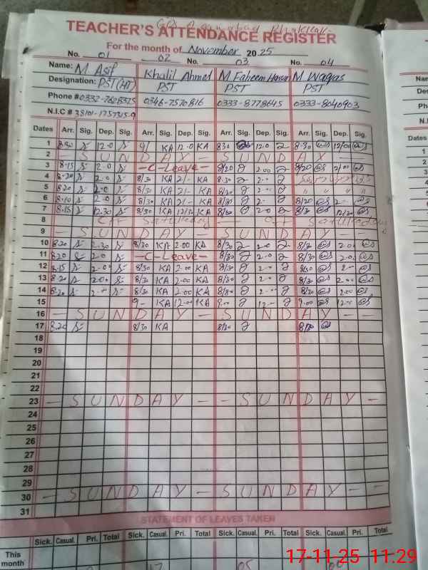 | CNIC | Full Name | Designation | R/C | Absence During Last Calender Month |