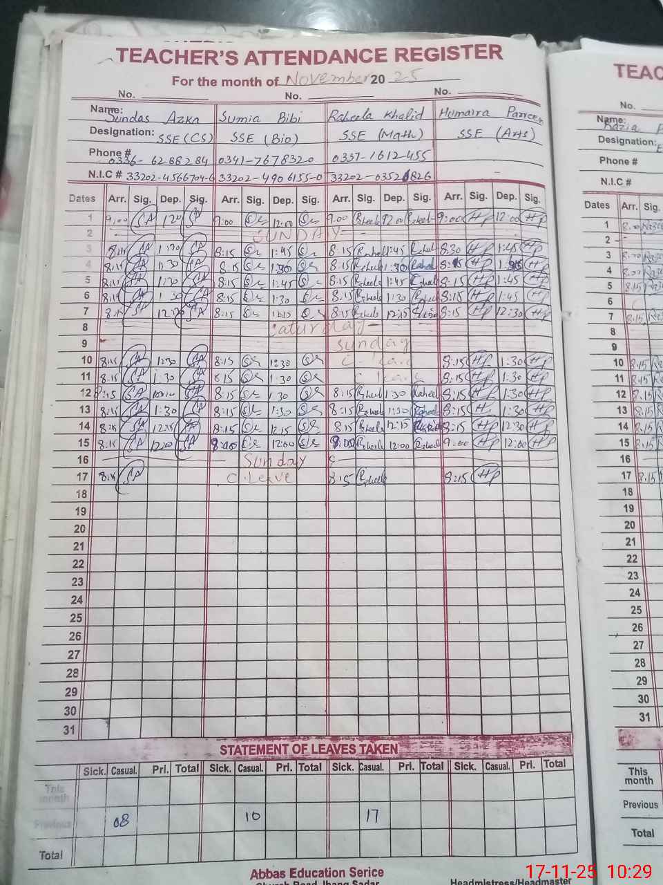 | CNIC | Full Name | Designation | R/C | Absence During Last Calender Month |