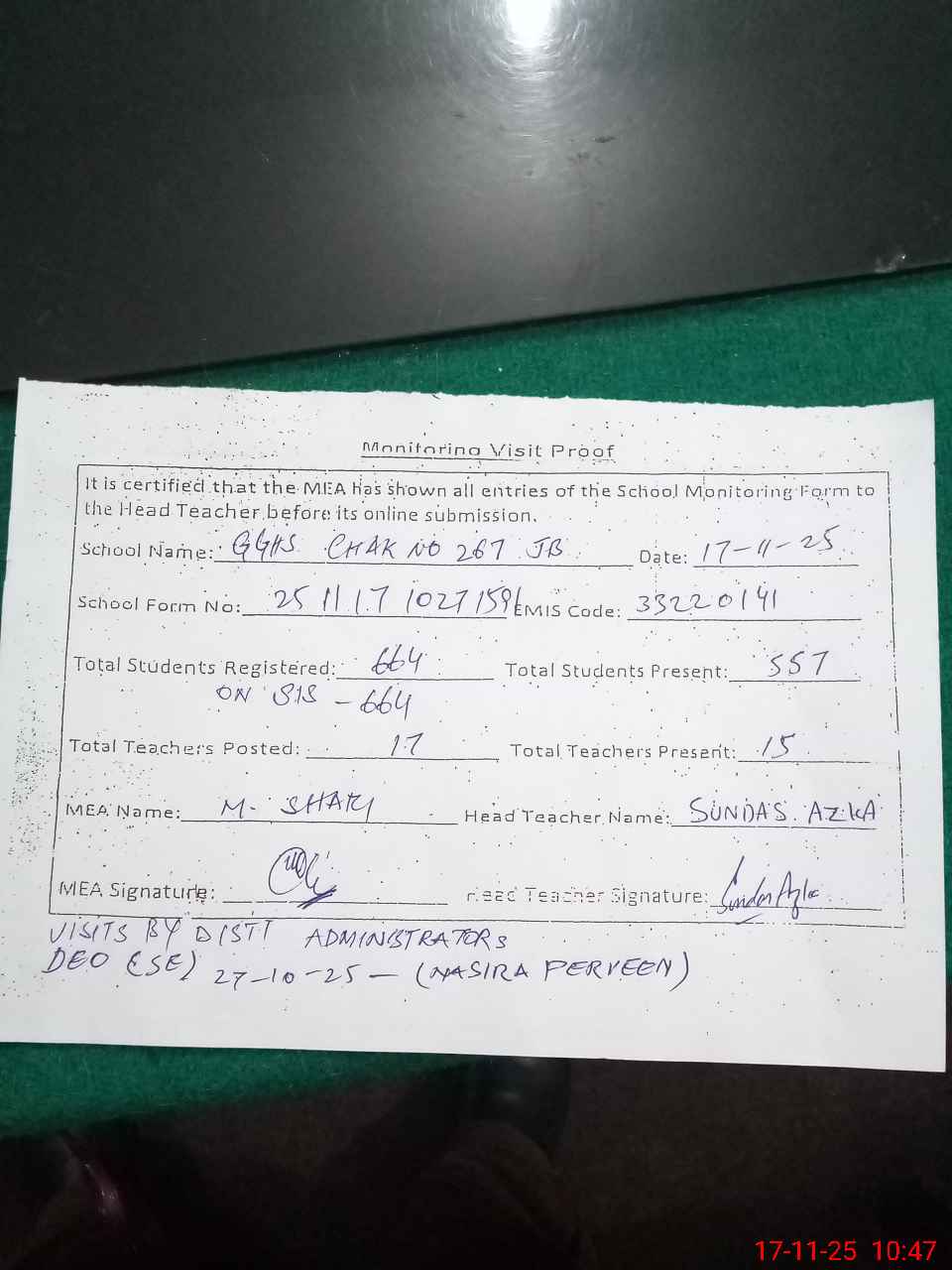 | Monitoring Date: 17-11-2025 | Start Time: 17-11-2025 09:55 AM | End Time: 17-11-2025 10:48 AM | Name of MEA: J-**** MU**** SH**** | |