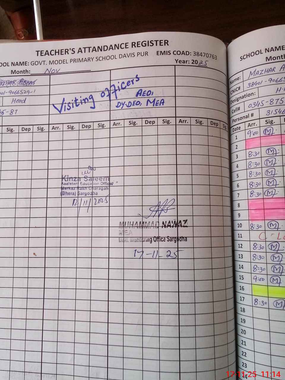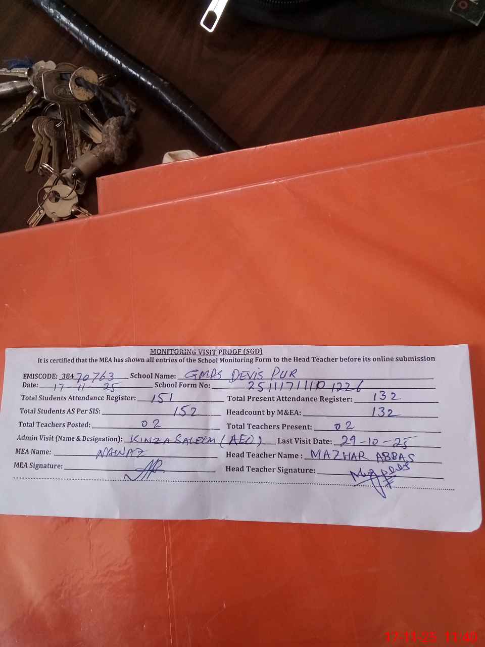 | Attendance Register | Head Teacher | MEA with School | Visit Proof |