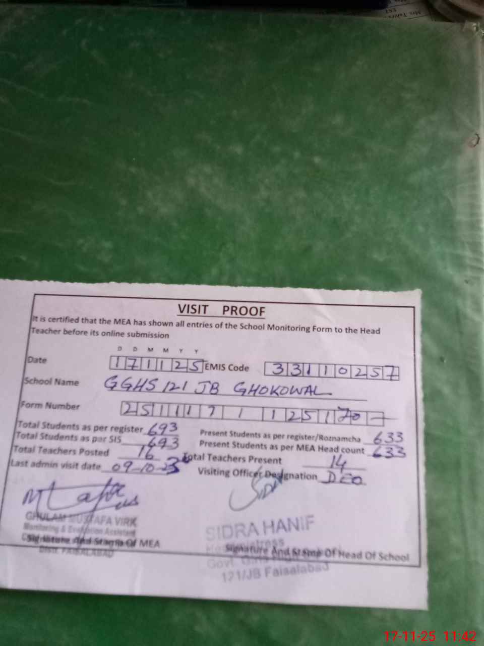 | Attendance Register | Head Teacher | MEA with School | Visit Proof |