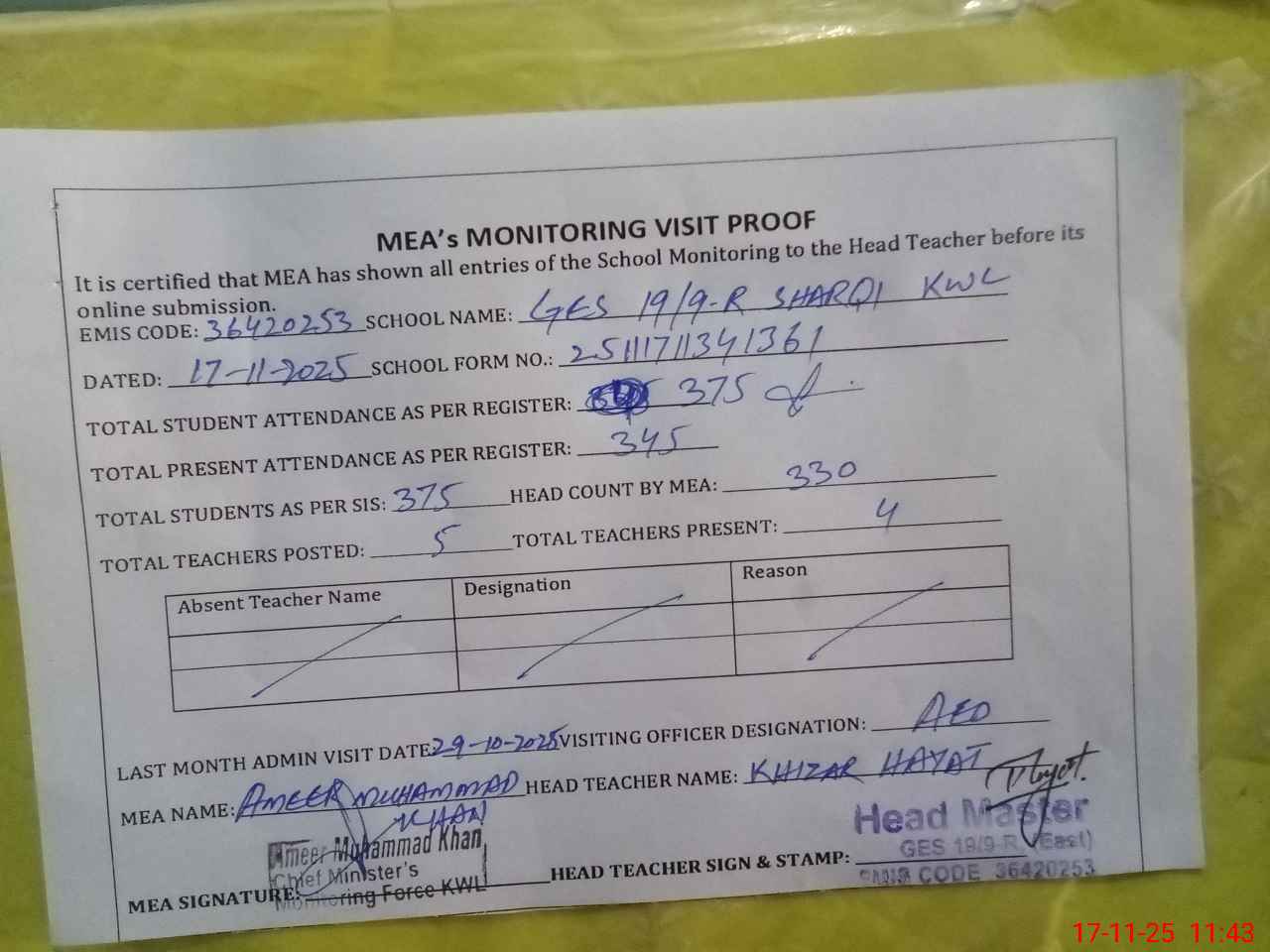 | EMIS Code: 36420253 | Name of School: GES 19/9-R SHARQI, KACHA KHUH | |||
