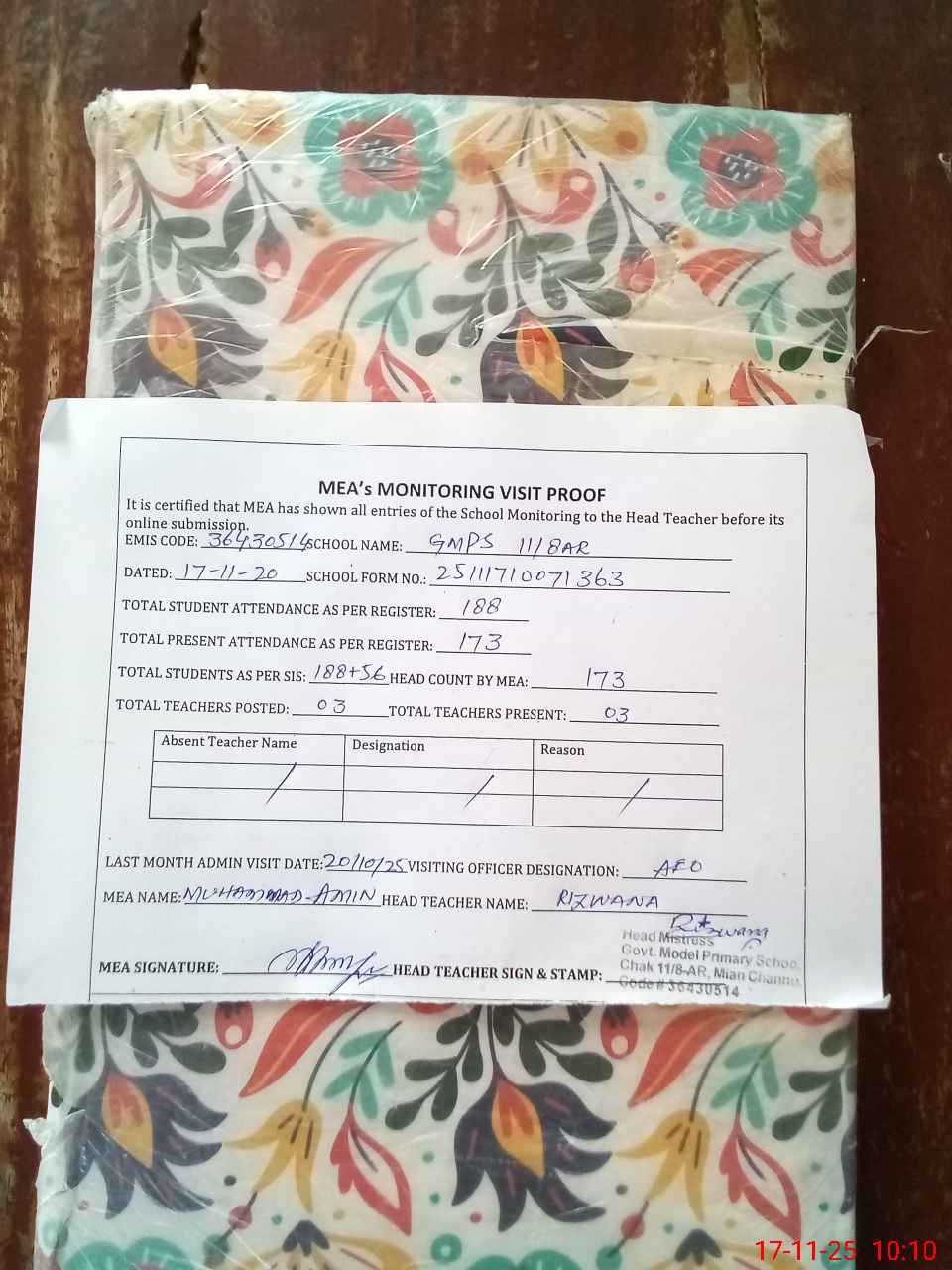 | Attendance Register | Head Teacher | MEA with School | Visit Proof |