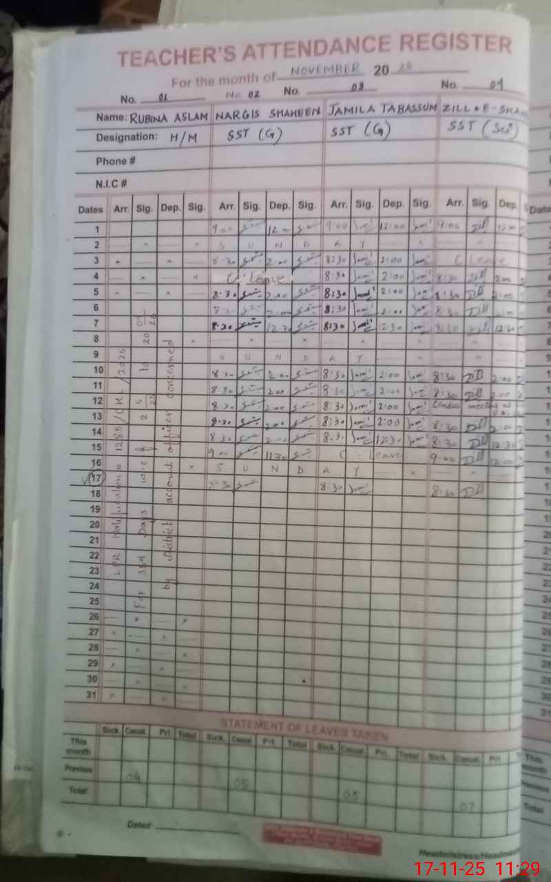 | CNIC | Full Name | Designation | R/C | Absence During Last Calender Month |