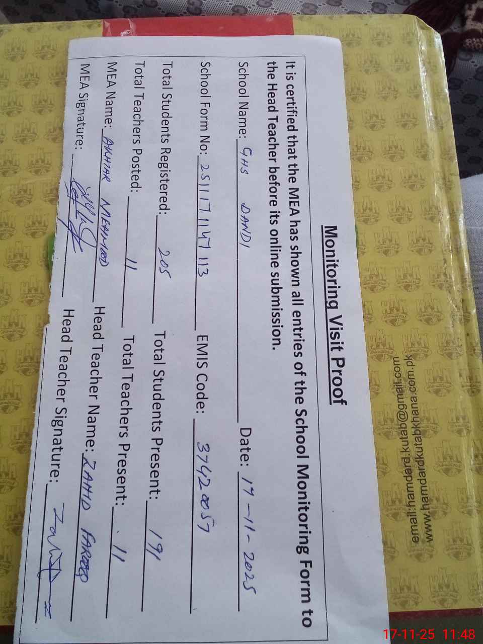 | Attendance Register | Head Teacher | MEA with School | Visit Proof |