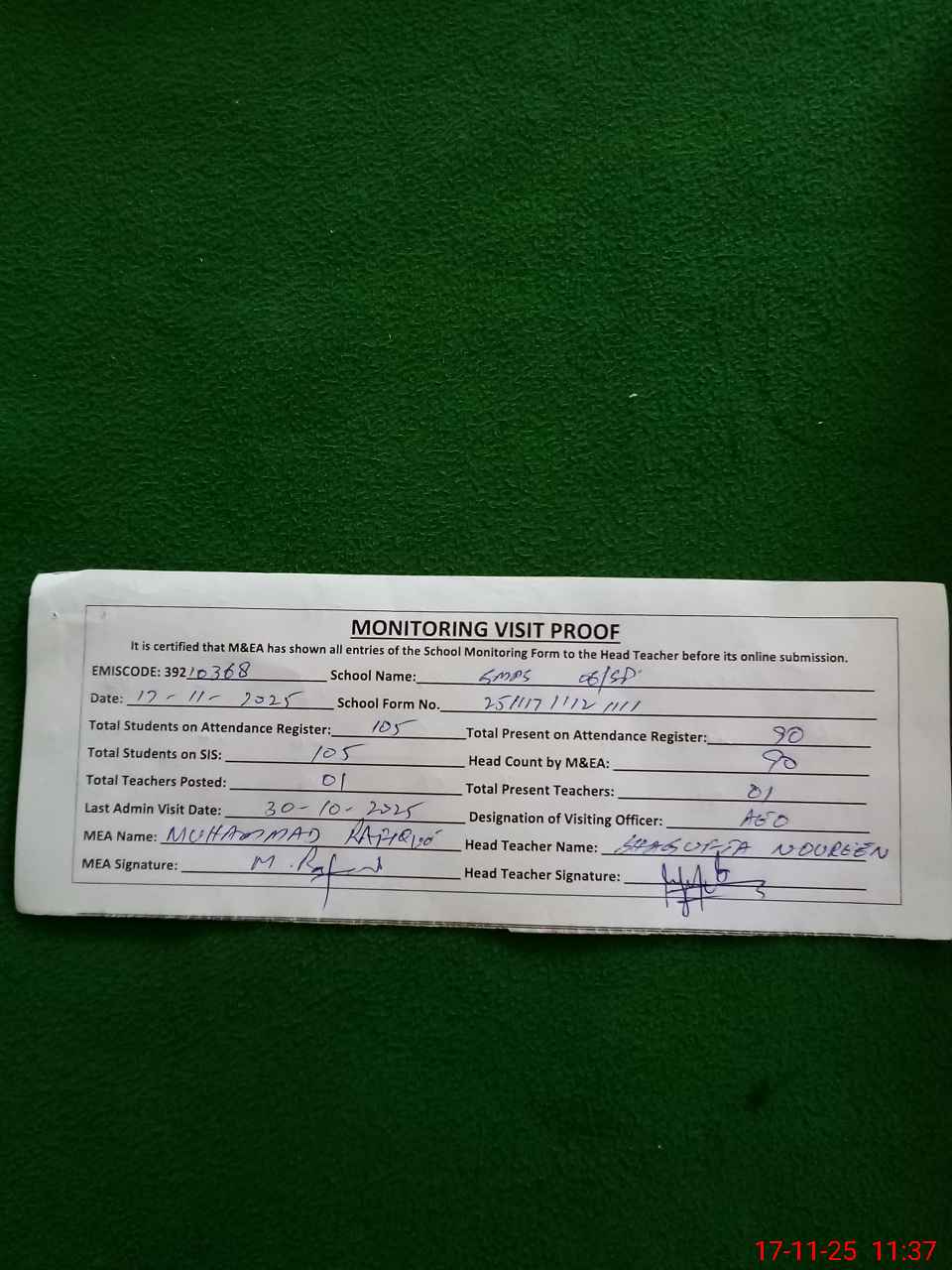 | Attendance Register | Head Teacher | MEA with School | Visit Proof |