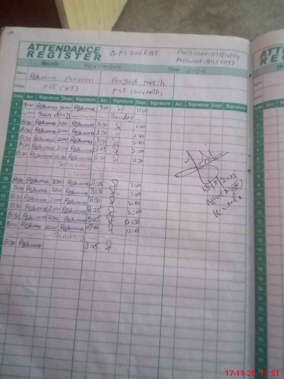 | CNIC | Full Name | Designation | R/C | Absence During Last Calender Month |
