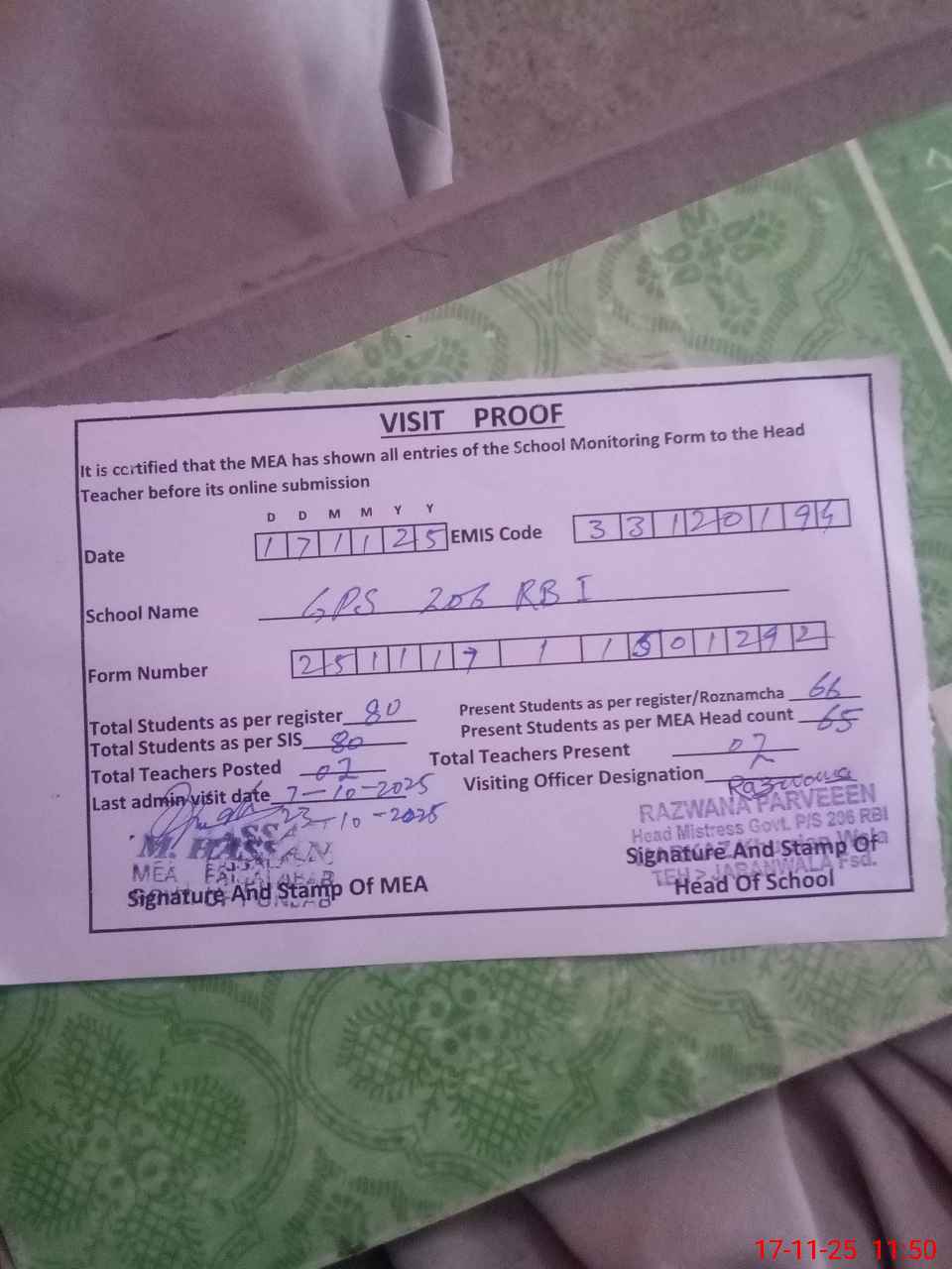 | Attendance Register | Head Teacher | MEA with School | Visit Proof |